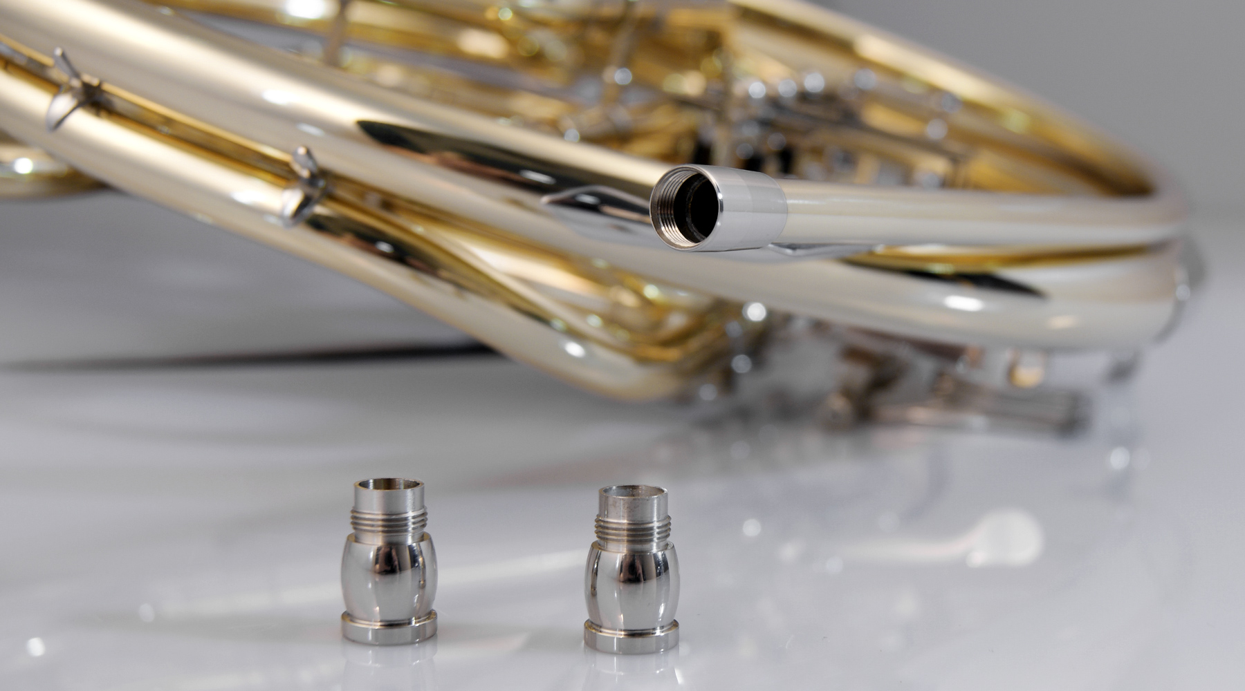 This means that there are, in effect, two different mouthpiece shanks in contact with one another, causing unavoidable variations on the positioning and conical fit of the mouthpiece inside the lead pipe. In order to permanently remove this geometrical discrepancy, we developed our Dürk Horns Receiver System, which allows you to place your mouthpiece perfectly inside the lead pipe. It helps you to fit as well as position your mouthpiece optimally. What’s more, you don’t even need a special tool to screw it on and off. A simple coin suffices.